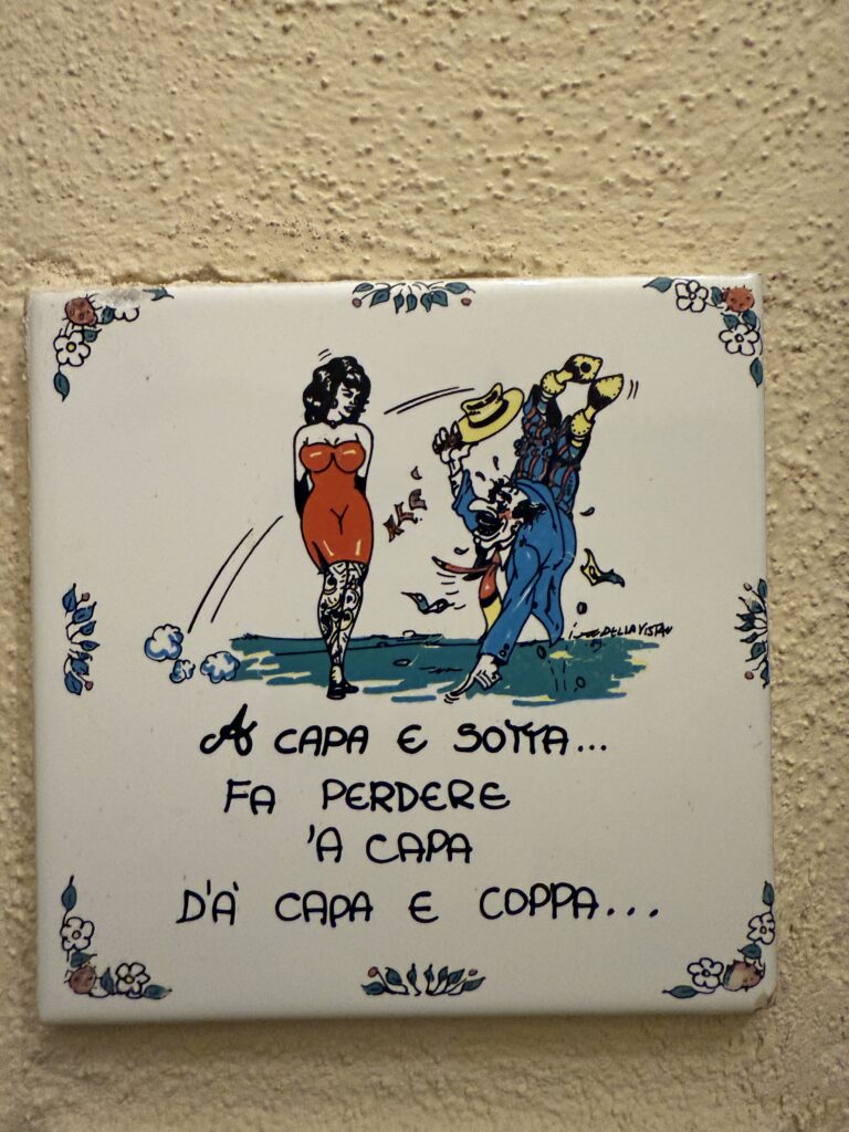 The phrase “‘A capa ‘e sotto fa perdere ‘a capa ‘e coppa” is a Neapolitan proverb that translates to “The head below makes the head above lose.” In simpler terms, it means that strong sexual desire or lust can cause someone to lose their sense of reason or judgment. This proverb reflects the idea that intense physical attraction or passion can cloud one’s mind and lead to irrational decisions.